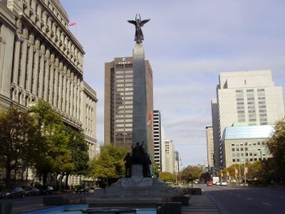 The South African War Memorial is a war memorial located at the intersection of University Avenue and Queen Street West in Toronto. The structure features three bronze figures positioned at its base and a winged figure holding a golden crown atop the column.