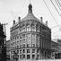 The Toronto Board of Trade Building stood seven stories tall with Gothic and Romanesque elements, featuring a rounded front corner and terracotta roofing.