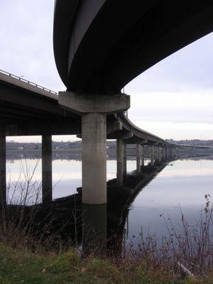 The bridge construction required opening swing spans on two existing bridges to allow tugboats and barges to navigate during the building process.