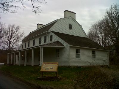 The Scott Manor House features a two-and-a-half story gambrel roof design with wishbone chimneys and original hand-hewn beams throughout its structure.