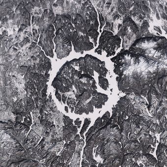 Manicouagan crater is an impact structure in Quebec formed by an ancient meteorite strike, now filled with a large reservoir. A circular island named René-Levasseur rises from the water at the center of this geological formation.