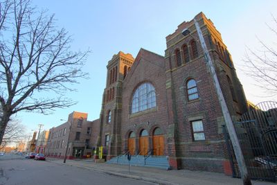 The Highland Arts Theatre occupies a red brick Gothic Revival structure with buttressed belfry towers and arched windows in downtown Sydney, Nova Scotia.