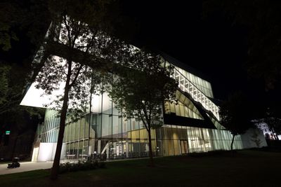 The facade features over 2,000 layered glass panels that change in opacity and texture across different floors of the structure.