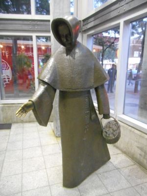 The bronze sculpture depicts Mother Émilie Gamelin carrying a basket of food, representing her commitment to helping the poor in Montreal.