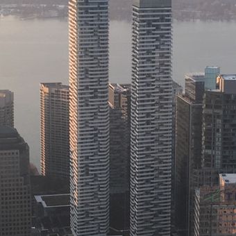 The twin residential buildings hold the distinction of being the tallest paired structures in Canada, standing at 63 and 67 stories respectively.