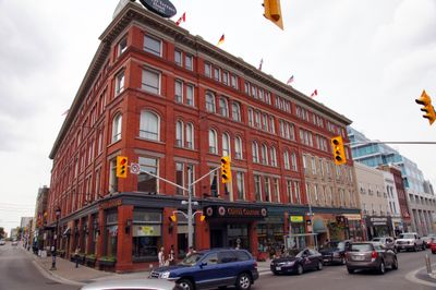 The Walper Hotel stands five floors tall in downtown Kitchener, featuring architectural elements that reflect the design principles of late 19th century Ontario.