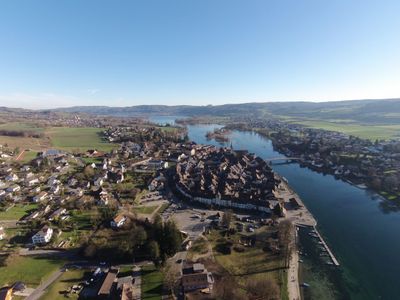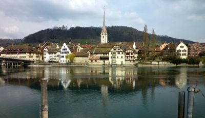 The town contains multiple restaurants, accommodation options, and shops within walking distance, while regular trains connect to Schaffhausen and Winterthur.