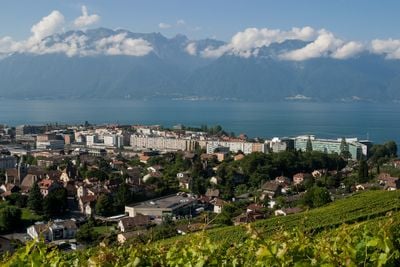Vevey extends along the northern shore of Lake Geneva, surrounded by Alpine mountains and terraced vineyards descending to the water.