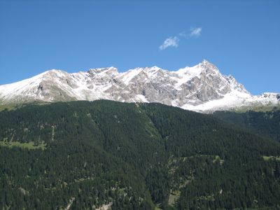 Piz Mitgel is a mountain summit in the Albula Range with a striking south-facing cliff that rises dramatically above Savognin in eastern Switzerland. The peak stands out in this part of the Alps due to its sheer rock wall.