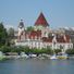 The Château d'Ouchy stands with its stone tower and gothic architecture along the waterfront, featuring 50 rooms spread across seven floors.
