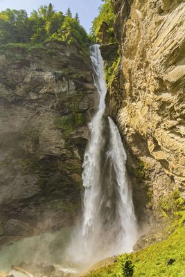The Reichenbach Falls consists of seven distinct drops along the Rychenbach stream, with the upper section reaching a height of 110 meters (360 feet). The largest drop plunges almost vertically over a rock face and creates a spray cloud visible from a distance when water flow is strong.