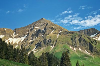 The Tannhorn mountain stands at 2,221 meters elevation within the Emmental Alps, featuring steep slopes and natural rock formations along its ridgeline path.
