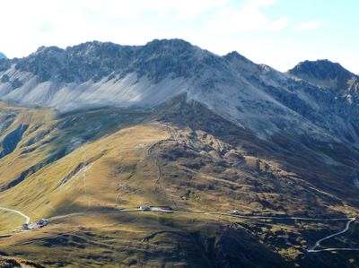 The limestone structure of Piz Umbrail creates a complex arrangement of walls and towers on its southern face, offering distinct climbing experiences.