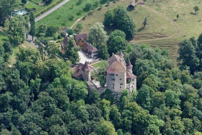 Wildenstein is a medieval fortress in Bubendorf featuring a fortified tower and interior rooms decorated with 17th-century paintings and period details. The property sits within landscaped grounds that blend English and French garden styles, creating a unified setting around the structure.