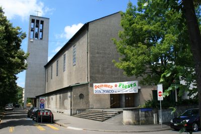 The Don Bosco Church features modern architectural lines with geometric shapes, clean surfaces, and a bell tower at Waldenburgerstrasse 32.