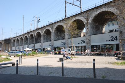 The Aussersihler Viadukt extends 550 yards through Zürich with 36 stone arches supporting the railway tracks, connecting different sections of the city.