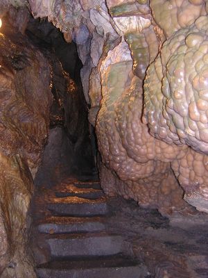 The cave contains both tufa and travertine deposits, creating two distinct types of mineral formations with different appearances and textures. Visitors can observe how these different deposits form separate visual zones throughout the passages.