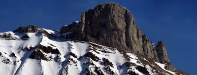 The mountain features distinct geological formations that reveal layers of alpine rock structures dating back millions of years.