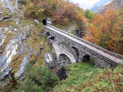 The Pantenbrücke consists of two stone bridges stacked on top of each other, crossing the deep Linth gorge south of Tierfehd.