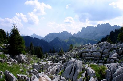The mountain presents an unusual combination of vertical Dolomite-like cliffs alongside gentle alpine meadows, creating distinct environments for flora and fauna.