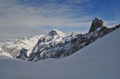 The Dent Favre reaches an elevation of 2,917 meters and stands between the Dent de Morcles and the Grand Muveran in the Bernese Alps.