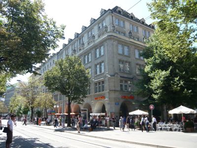 The building was constructed in 1914 during a period of commercial expansion that transformed Zurich's city center. It quickly became an important shopping destination after opening, reflecting the city's growing retail needs.