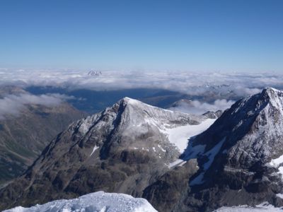 To climb the mountain, hikers must use either Boval Hut at 2495 meters or Tschierva Hut at 2583 meters as their base points for the ascent. Both huts provide shelter and serve as starting points for reaching the summit.