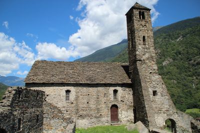 Santa Maria del Castello is a Romanesque church that stands on a hilltop in Giornico and features two parallel naves, a rectangular choir, and a bell tower positioned next to a round apse. The building combines these elements in a way that reflects the northern Italian architecture of that time.