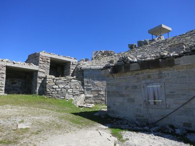 Fort Stöckli stands at 2400 meters above sea level beneath Stock mountain, featuring artillery positions and observation towers facing the Oberalp Pass.