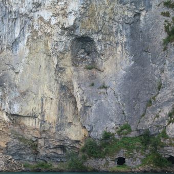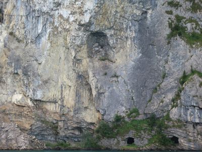 The Artilleriewerk Isleten consists of two batteries carved into rock formations along Lake Lucerne, featuring four 10.5 cm defensive cannons.