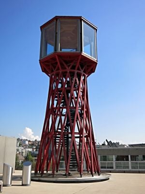 The TBZ Turm stands 13.3 meters tall on the roof of the Technische Berufsschule, featuring a red wooden exterior and an observation platform at 9.6 meters.