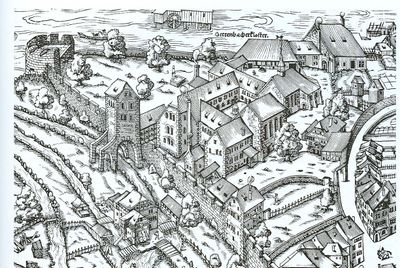 The Oetenbach nunnery stood near the Limmat River, featuring a dormitory, church buildings, and gardens within the medieval city walls of Zurich.