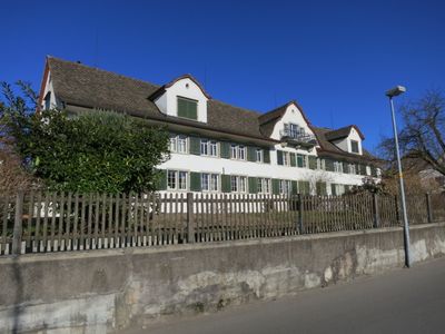 Oetikon, Häuserzeile am Hafen mit patriotischem Denkmal und Schiffstation