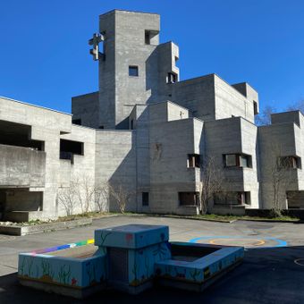 The St. Johannes church stands in central Lucerne, featuring a strong geometric structure and concrete construction that marks the local skyline.