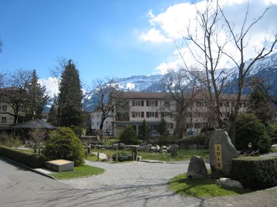 The garden combines Japanese landscaping with Swiss alpine elements, featuring rocks sourced from both Otsu and Interlaken regions.