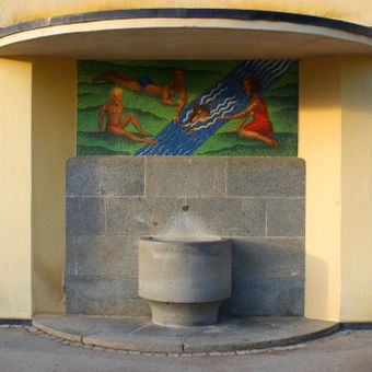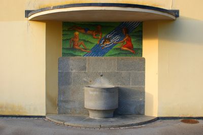 Courtyard fountain school house Stapfenacker, fountain with mosaic in the city of Bern, Switzerland