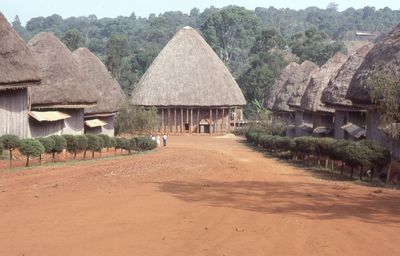 The Chiefdom of Bandjoun features traditional huts with carved wooden pillars and colonnades, representing regional architectural characteristics of the Bamiléké people.
