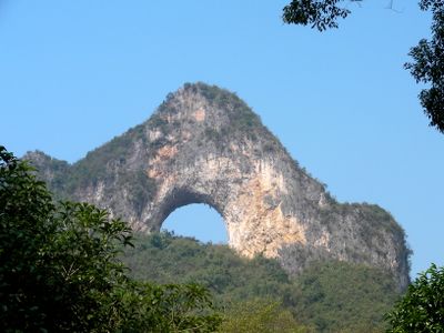 The limestone arch of Moon Hill rises 380 meters above the ground, forming a circular opening measuring 50 meters in height.