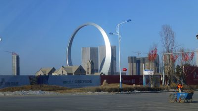 The Ring of Life stands as a circular steel structure rising 157 meters in diameter against the Fushun city skyline, forming a complete circle.
