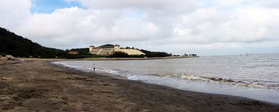 The one-kilometer beach combines both black and yellow sand, stretching along the eastern coast of Coloane Island with views of the South China Sea.