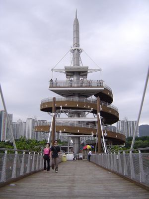 The Tai Po Lookout Tower stands 32.4 meters tall within Tai Po Waterfront Park, next to the shore of Tolo Harbour in Hong Kong.