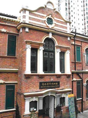 The museum occupies a red-brick Edwardian structure with Greek columns, displaying collections of medical instruments and exhibits about health developments in Hong Kong.