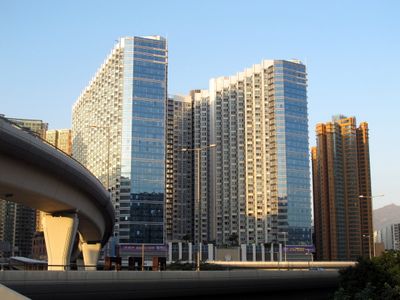 The residential complex reflects Hong Kong's approach to building upward due to limited land, with high-rise towers packed closely together throughout the district. This vertical construction pattern shapes daily life and how residents experience their neighborhood in the middle of the city.