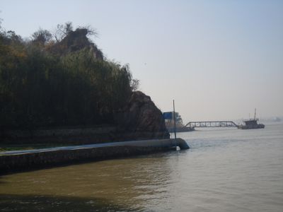 Swallow Rock is a natural landmark along the Yangtze River in Jiangsu Province featuring distinct stone formations with elevated views across the water and surrounding terrain. From this high point, visitors can see far down the river and across the landscape below.
