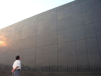 The memorial park extends over 5.44 hectares with a central monument consisting of a 30-meter tall main tablet and surrounding granite reliefs.