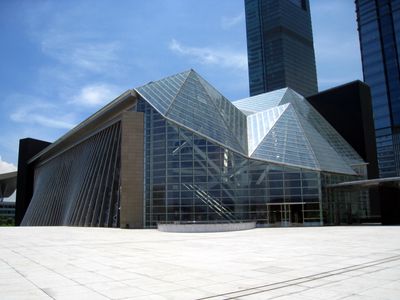 The Shenzhen Cultural Center combines a concert hall with 1800 seats and a public library in a modern architectural complex designed by Arata Isozaki.