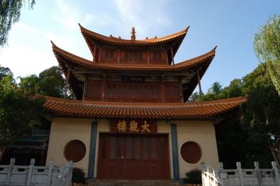 The three-story Daguan Lou stands within a 478,000-square-meter park, featuring traditional Chinese architecture alongside Dianchi Lake in Kunming.