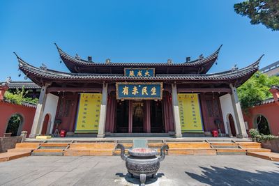 The temple features yellow roof tiles, traditionally reserved for imperial structures, and red-painted walls that reflect its designation as a national cultural heritage site.