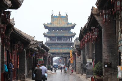 The Pingyao Shilou tower stands at the northern gate of Pingyao, featuring traditional Chinese architectural elements with detailed eaves and ornate roof structures.