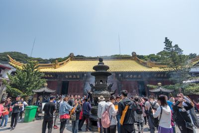 Located at the summit of Mount Putuo, Huiji Temple features horizontal halls spanning 6,188 square meters with 145 buildings in Eastern Zhejiang architectural style.